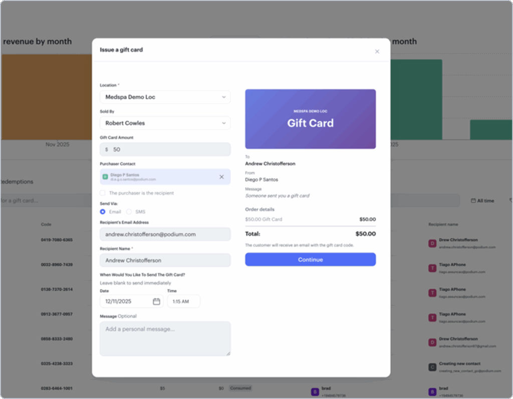 MedSpa businesses can view gift card revenue by month and track remaining gift card balances, so you always know how much value is outstanding across issued gift cards.