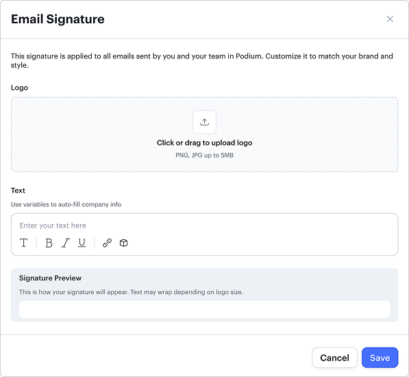 Add a branded signature to all emails sent through Podium. Upload your logo and customize footer text to reflect your business and brand. Signatures support dynamic variables, so details like your business address or contact information stay up to date automatically. Once configured, the signature is applied to every outgoing Podium email.