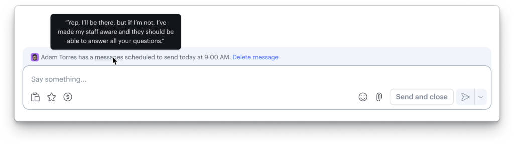 See messages scheduled by all users in one place. When needed, delete messages scheduled by other users. Notes in conversation history are left when scheduled messages are deleted.