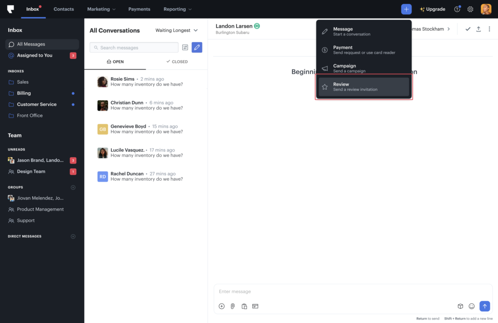 Send a review invitation from the main navigation bar: We’ve also added the capability to send a review invitation directly from the “+” button—no matter where you are in Podium. Once clicked, you can select a recipient, location, and template using the same review invitation form.