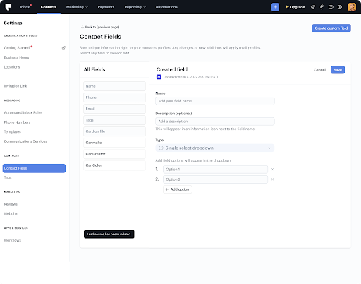 Custom fields are an effective way to customize your CRM, track customer behavior, and store the information that matters most for each customer. Along with the standard fields that were already available on a contact’s profile, you can now add fields for information relevant to your business. Examples could include “Car Model” for an auto dealer, “Member Number” for your loyalty program, or even “Birthday.”